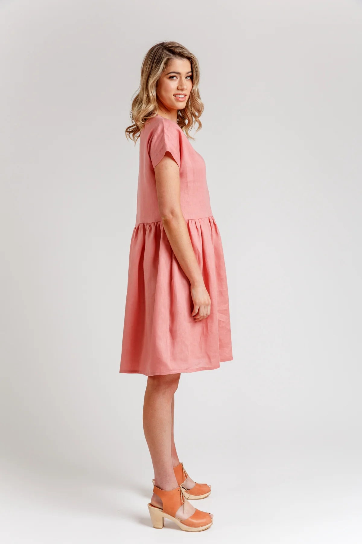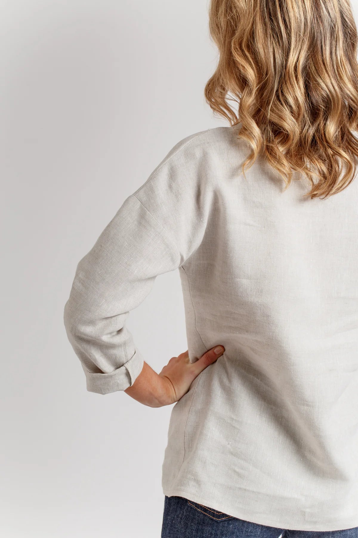 Olive is a relaxed silhouette top or dress with v-insert. Pattern features a drop shoulder, multiple sleeve finishes, dress or top variations, and optional breast patch pocket.