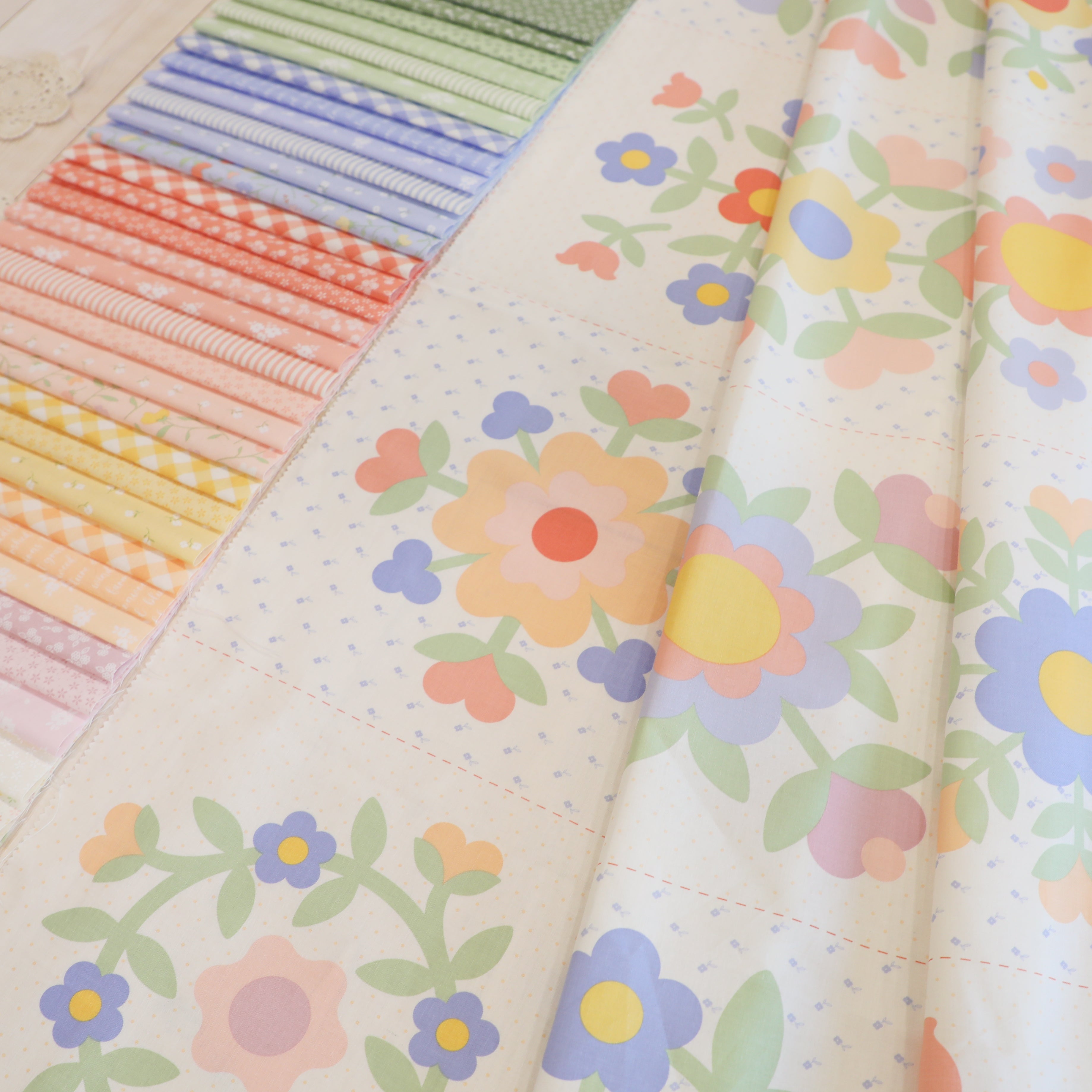 Fabric collection from My Sew Quilty Life. This collection features a gorgeous palette of soft pastels—buttery yellows, blush pinks, warm corals, fresh greens, and gentle blues—perfect for quilting, patchwork, and creative sewing projects. Whether you're crafting a cozy quilt or adding whimsical touches to your next creation, these soothing hues blend beautifully together. Ideal for quilters and fabric lovers seeking that sweet, dreamy aesthetic.