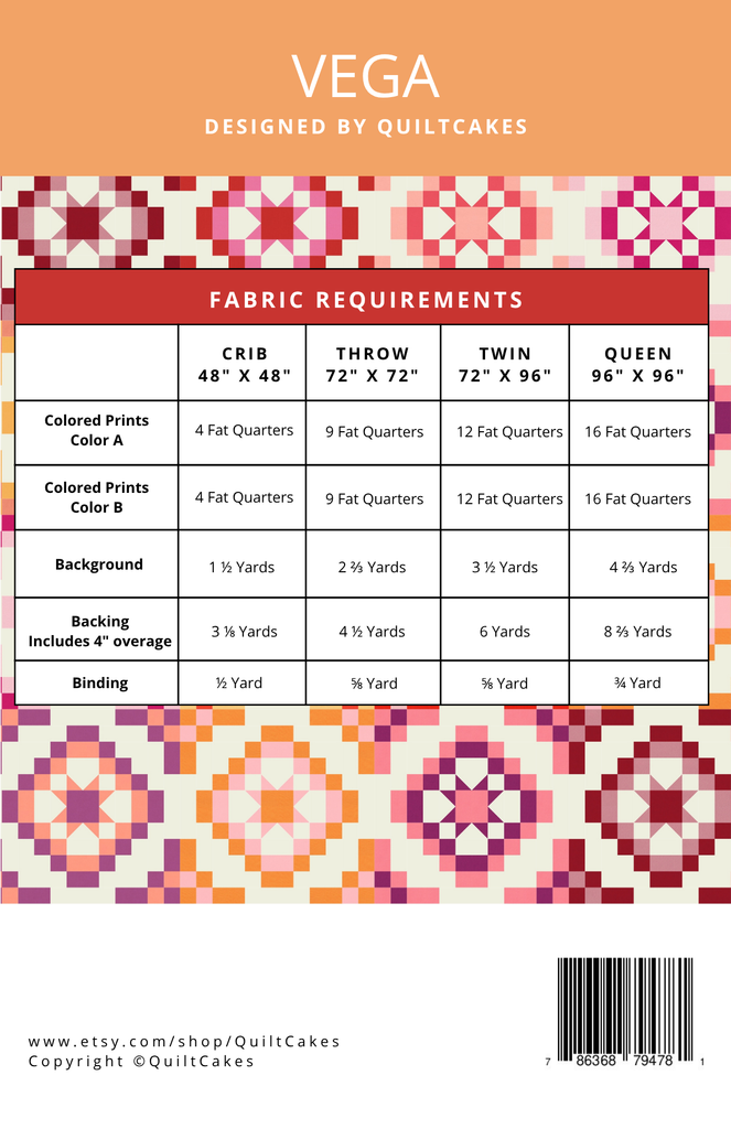 The Vega Quilt by Amanda Kelly of QuiltCakes Skill Level: Beginner Skills Include: Utilizes flying geese. An accurate and consistent 1/4" seam allowance is necessary. Pattern assumes that the quilter has basic piecing and quilting knowledge. Pattern is fat quarter friendly. Requirements listed in photos. Width of fabric must be at least 42" for yardage and is assumed unwashed. * This listing is for the paper copy of this pattern. * You will receive a booklet. * Patterns are printed to order will be mailed first class within 2 weeks. Copyright QuiltCakes. Pattern cannot be reproduced or sold, duplication is prohibited.